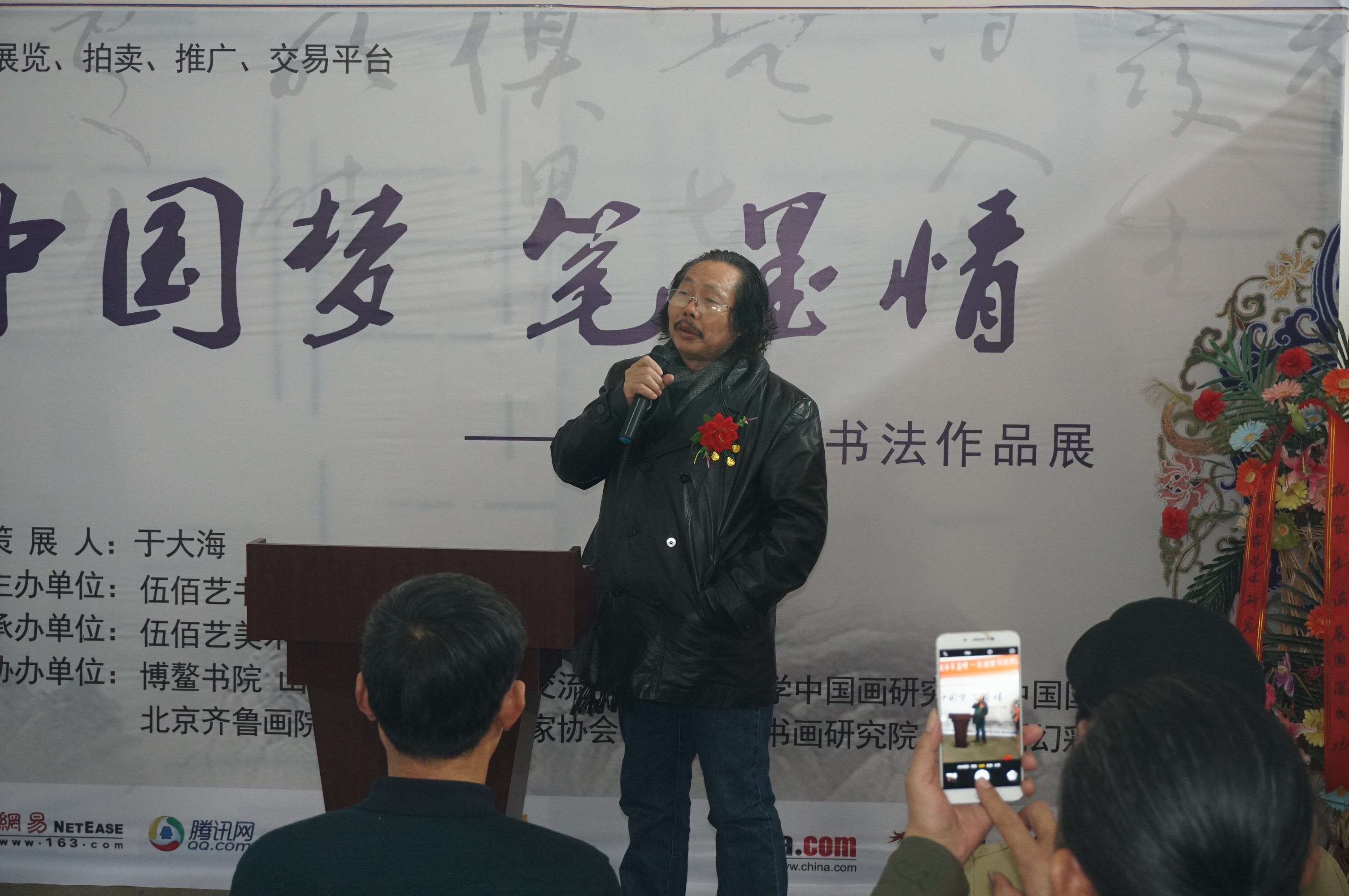活动上,伍佰艺美术馆馆长于大海代表伍佰艺书画网和伍佰艺美术馆对参加书法展的嘉宾表示热烈的欢迎,他表示,伍佰艺美术馆为艺术家进行宣传、推广、展览、作品销售提供一个良好的服务平台,努力为文化大发展、大繁荣作出贡献,并祝本次书法展取得圆满成功。