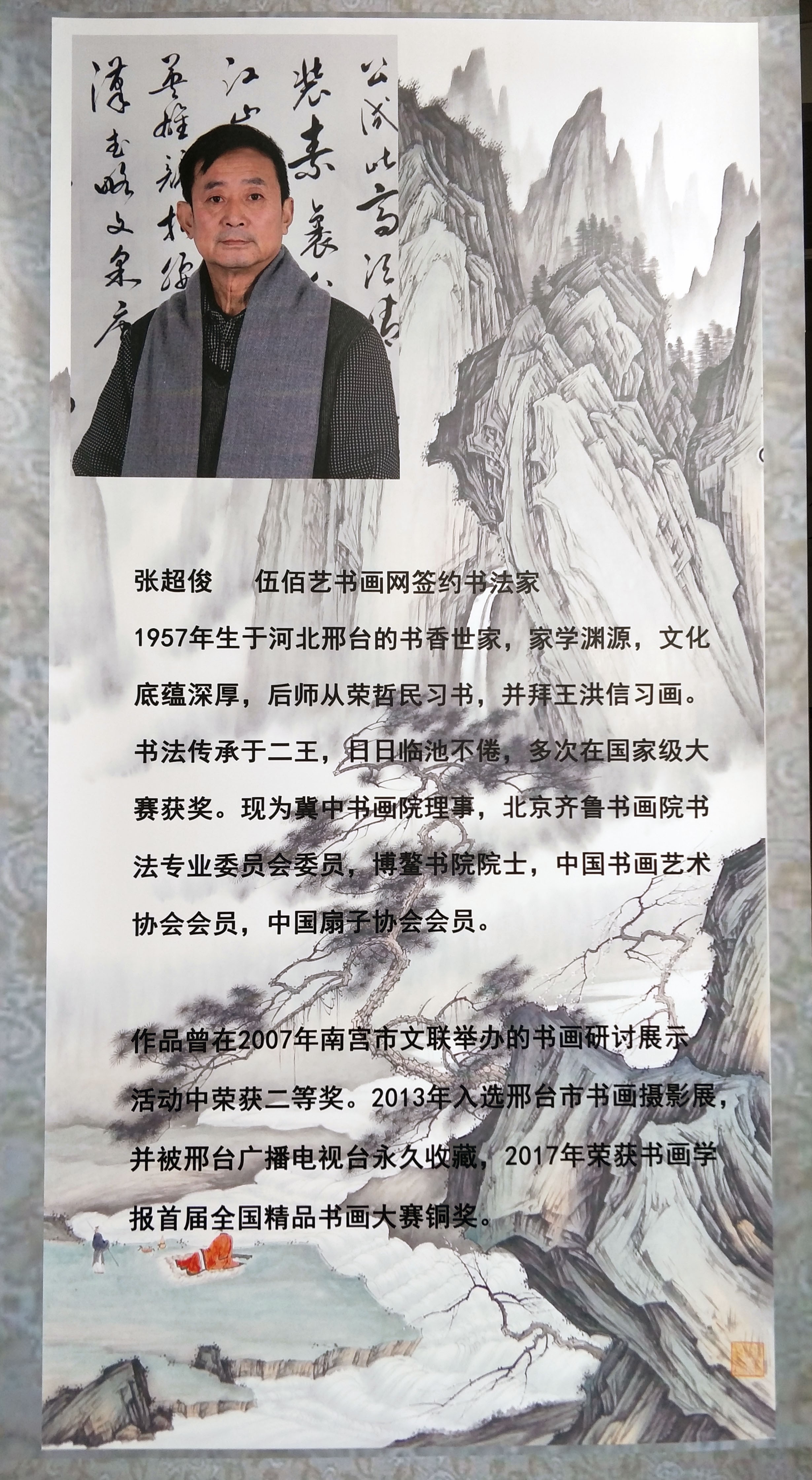 张超俊 伍佰艺书画网签约书法家,1957年生于河北邢台的书香世家,家学渊源,文化底蕴深厚,后师从荣哲民习书,并拜王洪信习画。书法传承于二王,日日临池不倦,多次在国家级大赛获奖。现为冀中书画院理事,北京齐鲁书画院书法专业委员会委员,博鳌书院院士,中国书画艺术协会会员,中国扇子协会会员。作品曾在2007年南宫市文联举办的书画研讨活动中荣获二等奖,2013年入选邢台市书画摄影展,并被邢台广播电视台永久收藏,2017年荣获书画学报首届全国精品书画大赛铜奖。