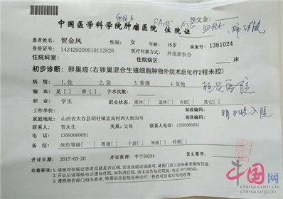 为了让孩子尽快好起来,贺永生决定先辞掉工作,安心陪着孩子看病。“我们再难,也不能耽误孩子的病情。”2016年11月18日,贺永生再次借钱,让贺金凤在山西省肿瘤医院进行(右附件切除+左卵巢活检+大网膜切除+盆腔淋巴结清扫+腹主动脉旁淋巴结清扫)手术,手术过程中再次确诊为右卵巢未成熟性畸胎瘤,手术完住院一周,便回家修养,以后的日子里还需要一个月化疗一次。后继于12月2日和1月18日先后进行了两次化疗。