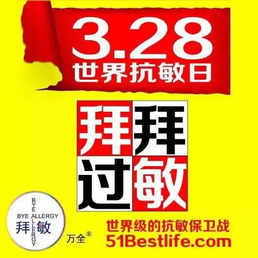 过敏疾病已经成为威胁人类健康最流行的疾病之一,特别是在中国,由于环境污染的加剧,有近四分之一的成人和三分之一的儿童遭受过敏性疾苦。 为提高人们对过敏性疾病的认识,号召世界各国和国际组织在这一天举办过敏疾病防治活动,宣传和普及预防过敏性疾病的知识。 拜敏万全抗敏临床研究中心与中国和世界致力与过敏治疗解决方案的科学家和广大患者共同将328拟定为世界抗敏日。
