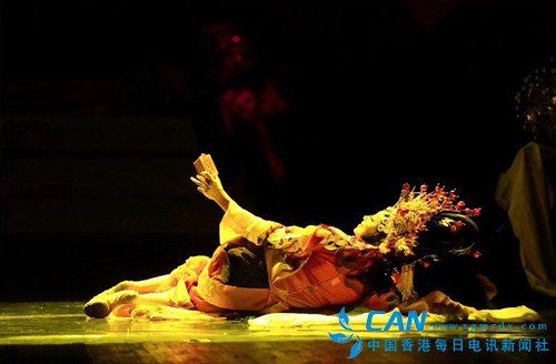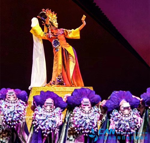 “云想衣裳花想容,春风拂槛露花浓;若非群玉山头见,会向瑶台月下逢”,在低沉磁性的男声抑扬顿挫吟诵李白《清平调》的声音中,酒后微醺的杨贵妃在亭台上翩翩起舞,婀娜多姿的身影水袖长舞,曲弯绕回的身段柔软飞旋,宫女们轻舞轻纱曼妙呼应,玫瑰色的光束挥洒而下,音乐、舞蹈、美女、醇酒,展现出大唐盛世的浪漫恣意。