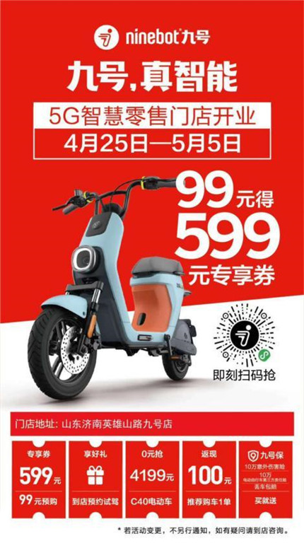 "九号机器人"登陆济南修耐德电动车连锁旗下六家5G智慧九号真智能零售门店将于4月25日盛大开业。