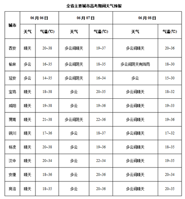 预计高考期间,7-8日全省以多云到晴的天气为主,陕北、秦岭山区多分散性阵雨或雷阵雨天气,关中部分地区、陕南东部有35~37℃的高温天气。