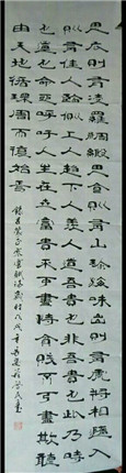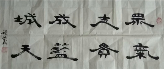 我对隶书,知之甚少。看程先生的隶书,明显继承了十大汉隶碑刻之一的《曹全碑》的体型扁阔,横平竖直,内紧外松,端庄秀丽的特点。而对其点画、撇捺等笔划做了重大改变,《曹全碑》中的书法,平、竖、左、右,仰、府诸点各求变化,而程先生把它大都处理为小圆点,如“平”、“乐”等字的点,他称之为“蟹睛”,对有的无点的字,如“不”字,他又作了“蟹睛”圆点添加,平添情趣。对字头有两点的处理为探头小尖,如“弟”,“美”等字,特别是“生”字,他把第一横左右两段上拐内探,恰似“蟹爪”,别具传神之妙。尤其对古隶中的撇、捺两笔,做了很大的夸张处理。如“人”、“今”、“文”等字,撇笔似太极向七点方向缓缓送出,然后收笔回锋成拳,捺笔则像运动健儿的长腿向五点方向迅疾登出,特别夸张,因为速度的疾缓把握有度,枯湿尽显。对下有四点的字的处理,更加有趣。