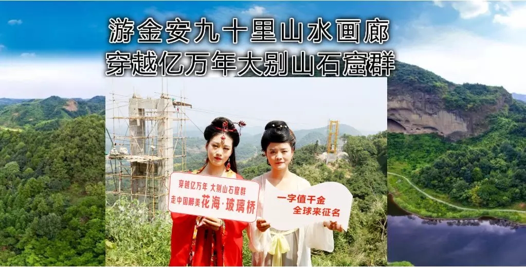“游金安九十里山水画廊·穿越亿年大别山石窟群·走中国醉美花海玻璃桥”“醉美玻璃桥”全球征名,谁为大别山石窟玻璃桥取个好名字,一字一千元,获奖者可终身免费游大别山石窟景区+体验玻璃桥。