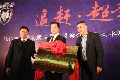 陕西省体育局副局长邹军、陕西省水务集团董事长王瑜同为陕西长安竞技足球俱乐部大秦之水队揭牌