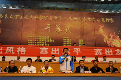 联赛形象大使、“草原苍狼”敖特根•巴特尔先生再次为同学们打气助威,希望同学们通过比赛的历练,提高技术,提升自信,打出当代大学生的风采。兰州军区老战士大学的教授书法家王金生、原兰州军区某部政委王长云、副政委王星旭、原兰州军区某部领导苟世峰、原陕西省军区领导杜鸿武等军区领导为大赛组委会书写赠送了书法作品。裁判员代表张子平、运动员代表长孙敏琪分别庄严宣誓。最后,由田苏辉先生郑重宣布:首届西安大学生武术散打联赛暨第八届西安高校散打赛开赛!来自莲湖区的群众武术表演社团以及电讯工程学院的学员们为大家上演了精彩的传统武术套路和刚劲雄壮的军体拳表演,“军民携手,共武莲湖”,开幕式现场气氛高涨。