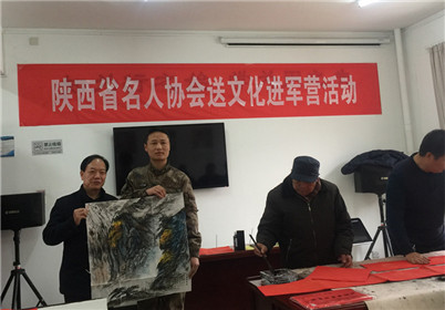 1月29日,大爱寒冬暖、军民情意浓,正值传统节日新年来临之际,陕西省名人协会秘书长王树潮、协会少工委副主任卞正华带领陕西省著名人物档案协会的会员代表刘平(西安市公安局原局长),郭政强(安康军分区政委)著名书画家李乐见以及韩城市文联主席樊君峰带领的韩城美协副主席王继江、薛增勤、老年书画学会党支部书记吴邦学、会长李岳民、副会长孙选民同省名人协会杂志社冯家敏,翟刘玲一起来到军营,现场为官兵挥毫泼墨,送上新春祝福。韩城市神龍矿业有限責任公司全程给予资助。