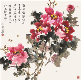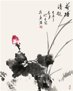 一花一叶总关情。德廉先生作画,不单是笔墨丹青的表象流露,而是情感浓烈的宣泄,使得他的一蓬荷叶、一丛牡丹、一朵小菊、一棵红梅、一树葡萄,看似“画面景物可以非常简单,但意兴情趣却很浓厚。”(李泽厚《美的历程》)。意兴情趣表现,不是一日之功能求得,那是需要长期对事物的观察,寻求的美感,才能把意兴情趣通过笔墨丹青传达于他人。记得有一次我们几个书法同道去潼关参加文化活动,主人家院里有几盆花,其中一盆看似红梅,那枝杆上带刺,花似梅花,粉红色,问主人,答曰是三角梅。我们也没在意,可有心的德廉先生即用照相机拍下来。回西安后,过了几天,他打电话对我说,你过来看看我画了一幅画。当我看到那幅画时,吃了一惊,这不是我们看到的三角梅吗?后来,他创作了许多不同构图的三角梅,非常出彩,直到现在,还没有哪个画家能画出他的三角梅,这就是一个有心加用心的画家,在别人不经意处,得到美的收获。画事,正是来源于真实,而又不求于真实,正象陈师曾说过“文人画不求形似,正是画的进步。”王德廉先生的画作,正是“夫画者,从于心者也。”(石涛《画语录》)。他创作的每幅画,简约不拖泥带水。他的书法技艺又为他作画,输送的线条,用笔干脆,力度俱佳;他的文学功底,又为他的画作平添一份文化内涵和隽永诗意。