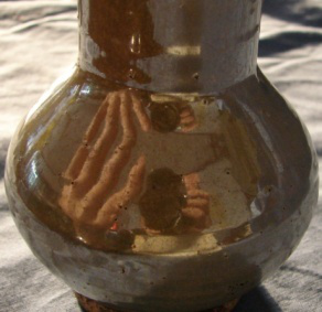 陶器带釉是中国陶瓷史上的一次革命性进步。陶器从什么时候带釉,出于怎样的原因挂釉,一直是我关注的问题。我藏有一件历史久远的古瓷器,从形体、眼睛、耳朵分析,这件古瓷器应该属于《山海经》时代的变异动物,我称它为“山鬼”。身上有不规则的片状挂釉。从工艺上分析挂釉出于偶然。先民或许在制陶时无意中产生了挂釉效果,之后在此基础上通过专门工艺创造了带釉陶器。带釉陶器在汉朝有了长足发展,代表作是“汉绿釉”。汉绿釉器物主要分陈设品和随葬品两大类。其中有一种被称作“粮仓”的器物,应该是鬲的衍生品种。