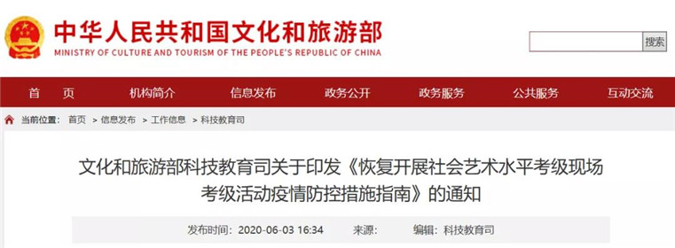 文化和旅游部于6月3日发出通知,明确要求在疫情防控的基础上有序恢复社会艺术水平考级现场考级活动。