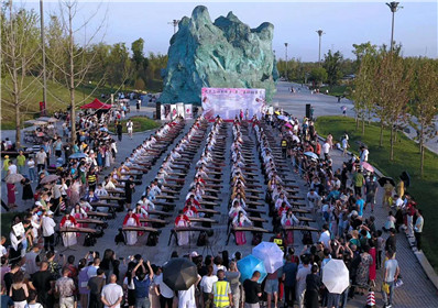 秦筝响起,秦声悠然。活动现场,300名身着华丽汉服的美女们席地而坐,精神抖擞,拨弦弹奏,奏出《绣金匾》《弹奏渔舟唱晚》《百花引》的美妙旋律。用“古筝之音”传递“文明之声”,吸引了诸多人的围观。
