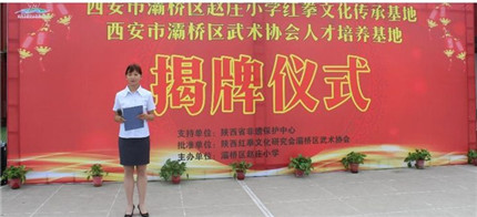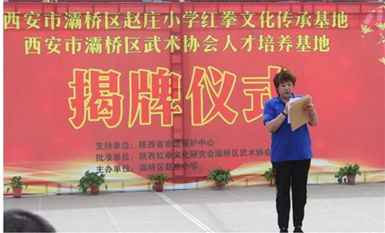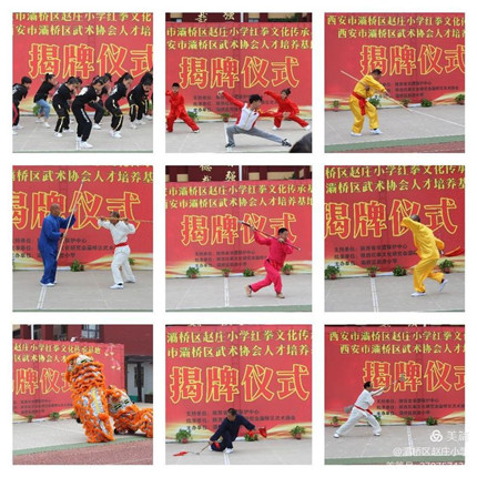 本次授牌仪式由陕西红拳文化研究会副会长闫惠敏宣读批文,陕西红拳研究会会长邵智勇发表讲话。由陕西红拳文化研究会邵智勇会长,灞桥区武术协会文博主席为灞桥区赵庄小学授牌,赵庄小学张校长发表讲话,并为红拳教练郭小满颁发聘书。最后,舞狮、街舞、“灞桥区武术协会红拳师傅8人示范红拳展演”、“赵庄小学武术社团表演红拳十三式”四个节目进行了展演。