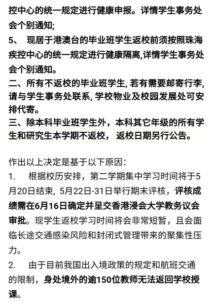 近日,同为中外合作办学高校的北京师范大学-香港浸会大学联合国际学院也发出了“不返校”通知。据悉,北师港浸大决定除本科毕业班学生外,本科其他年级的所有学生和研究生本学期不返校,返校日期另行通知。