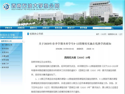 4月16日,西南石油大学官网发布《关于2020年春季学期本科学生9-12周继续实施在线教学的通知》。通知内容提到,鉴于目前新冠肺炎疫情形势,经学校研究决定,本学期校历9-12周继续按要求实施在线教学,同时请师生适当做好13周及以后开课课程的在线教学准备工作,第13周及以后是否继续实施在线教学根据新冠肺炎疫情防控情况另行通知。