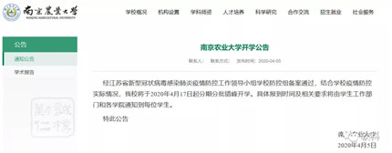 南京农业大学4月5日曾发布开学公告,称学校将于17日起分期分批错峰开学。据悉,因各类学生具体情况差别较大,学校尊重学生意愿,可选择自愿返校或不返校。